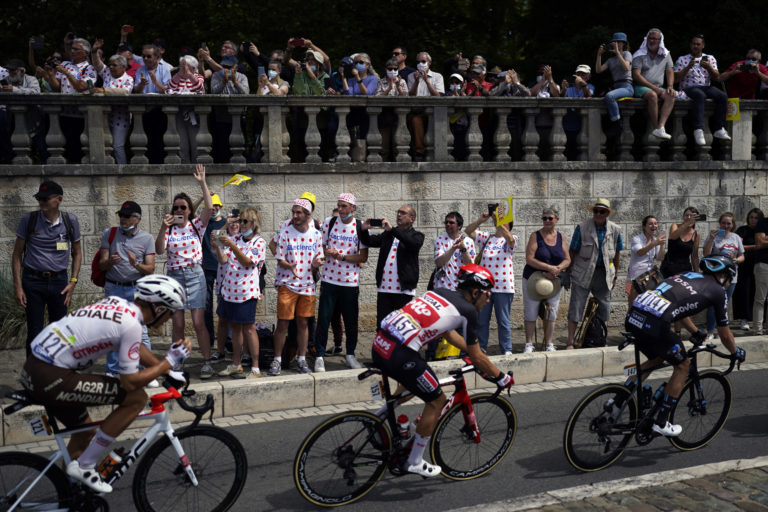 Diváci počas pretekov 7. etapy Tour de France 2021 z Vierzonu do Le Creusot (249,1 km). Vierzon, 2. júl 2021. Foto: AP Photo/Daniel Cole