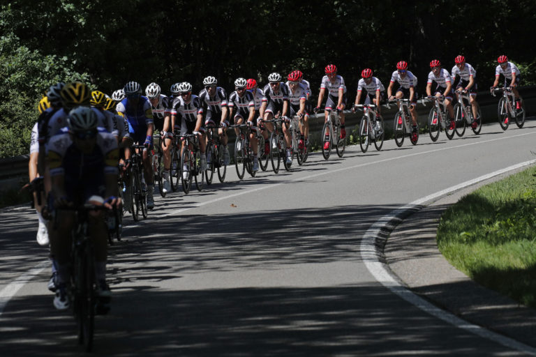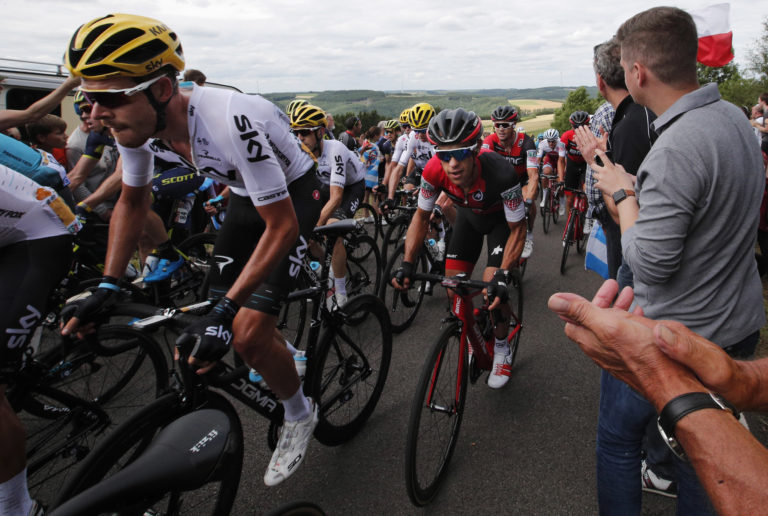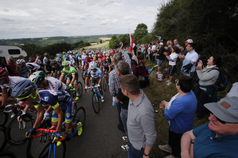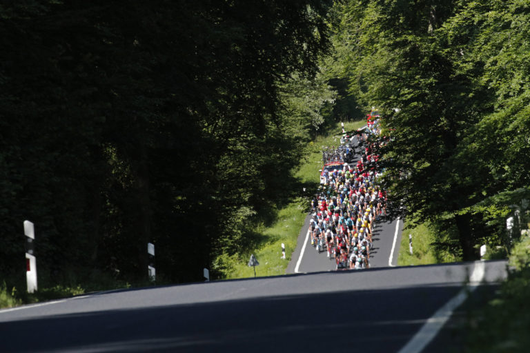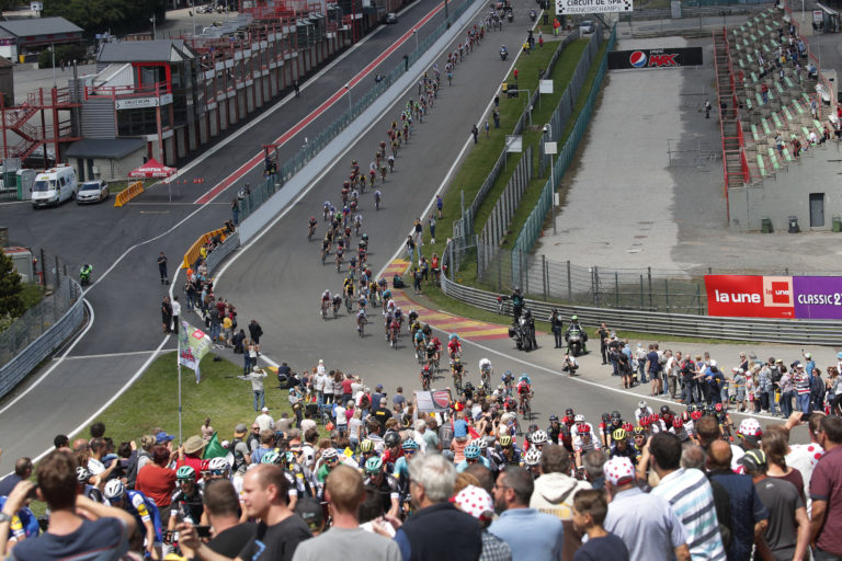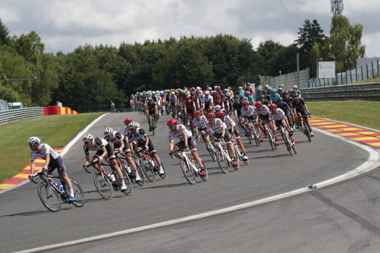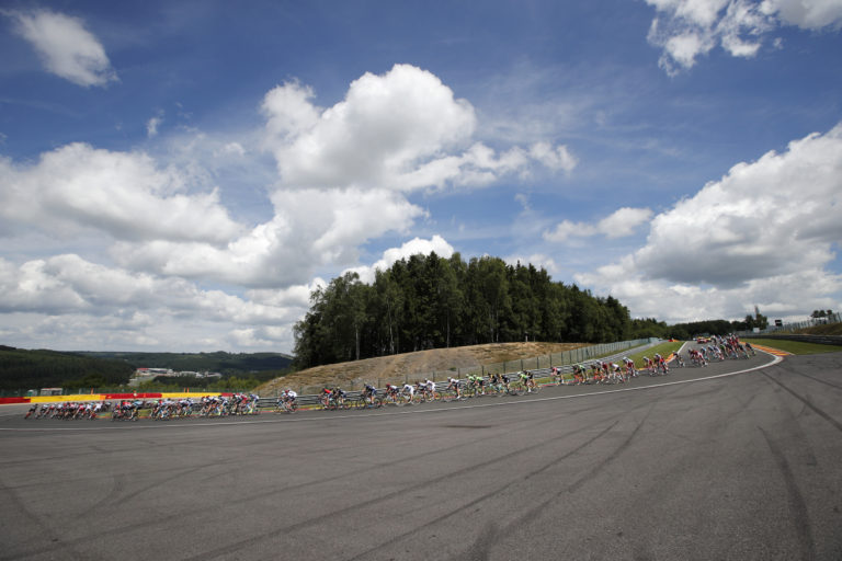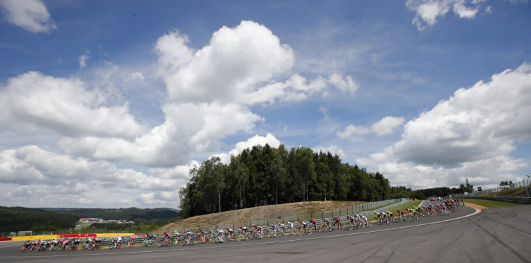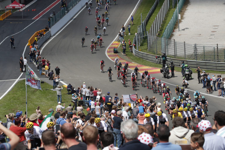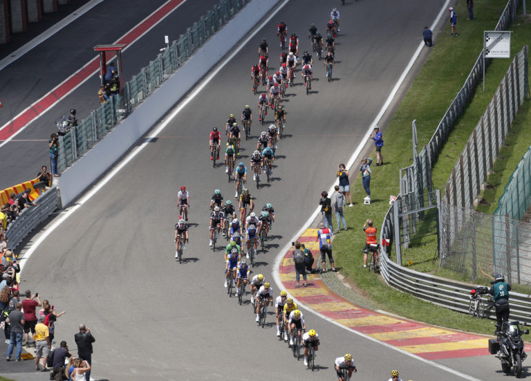 Cyklisti na známom okruhu Spa-Francorchamps počas tretej etapy 104. ročníka Tour de France, ktorá merala 212,5 km so štartom vo Vievers a cieľom v Longwy. Foto: SITA/AP