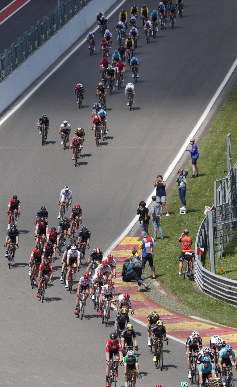 Cyklisti na známom okruhu Spa-Francorchamps počas tretej etapy 104. ročníka Tour de France, ktorá merala 212,5 km so štartom vo Vievers a cieľom v Longwy. Foto: SITA/AP.
