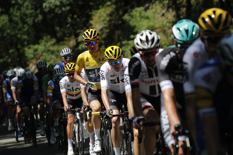 Britský cyklista Geraint Thomas (v žltom) počas tretej etapy 104. ročníka Tour de France. Foto: SITA/AP.