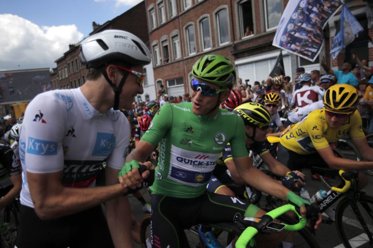 Švajčiarsky cyklista Stefan Kung s Nemcom Marcelom Kittelom pred štartom tretej etapy 104. ročníka Tour de France, ktorá merala 212,5 km so štartom vo Vievers a cieľom v Longwy. Vievers, 3. júl 2017. Foto: SITA/AP.