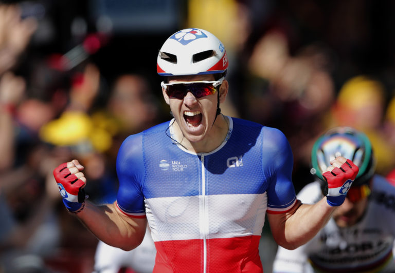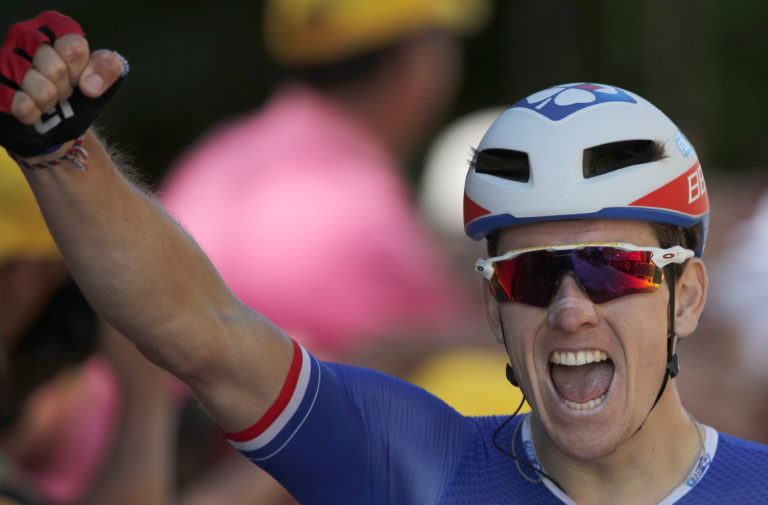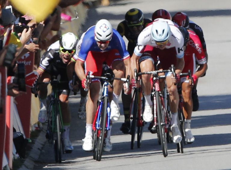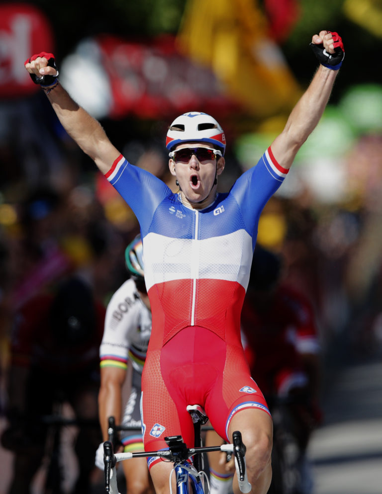 France's Arnaud Demare crosses the finish line to win the fourth stage of the Tour de France cycling race over 207.5 kilometers (129 miles) with start in Mondorf-les-Bains, Luxembourg, and finish in Vittel, France, , Tuesday, July 4, 2017. (AP Photo/Christophe Ena)