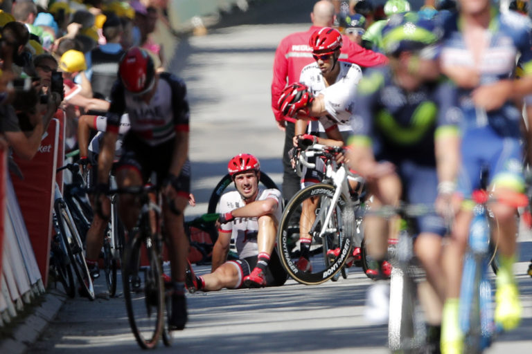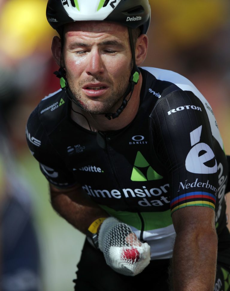 Otrasený britský cyklista Mark Cavendish po páde v závere štvrtej etapy 104. ročníka Tour de France. Vittel, 4. júl 2017. Foto: Stephane Mantey, Pool Photo via AP.