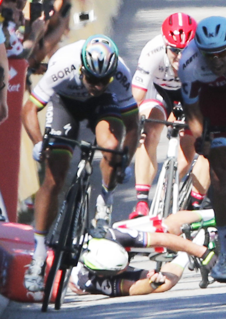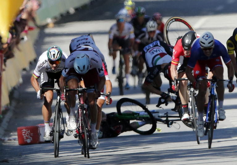 Kolízia britského cyklistu Marka Cavendisha (vľavo) s so Slovákom Petrom Saganom v závere štvrtej etapy 104. ročníka Tour de France. Vittel, 4. júla 2017. Foto: SITA/AP.