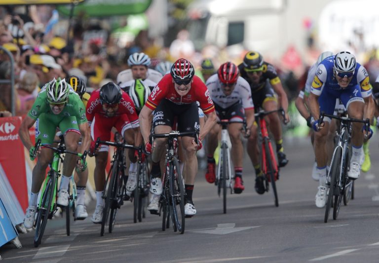 V špurte v závere šiestej etapy 104. ročníka Tour de France bol nemecký cyklista Marcel Kittel z tímu Quick-Step Floors. Troyes, 6. júl 2017. Foto: SITA/AP.