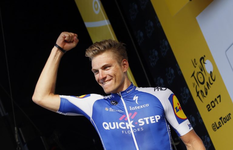 Nemecký cyklista Marcel Kittel z tímu Quick-Step Floors na stupňoch pre víťazov po jeho triumfe v šiestej etape 104. ročníka Tour de France z Vesoulu do Troyes (216 km). Troyes, 6. júl 2017. Foto: SITA/AP.