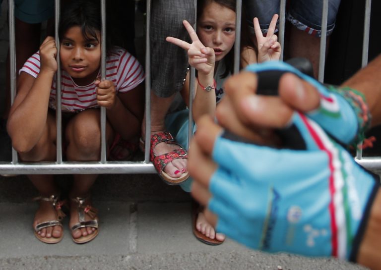 Dve dievčatá sa pozerajú na talianskeho cyklista Fabia Arua pred štartom siedmej etapy 104. ročníka Tour de France z Troyes do Nuits-Saint-Georges (213,5 km). Troyes, 7. júl 2017. Foto: SITA/AP.