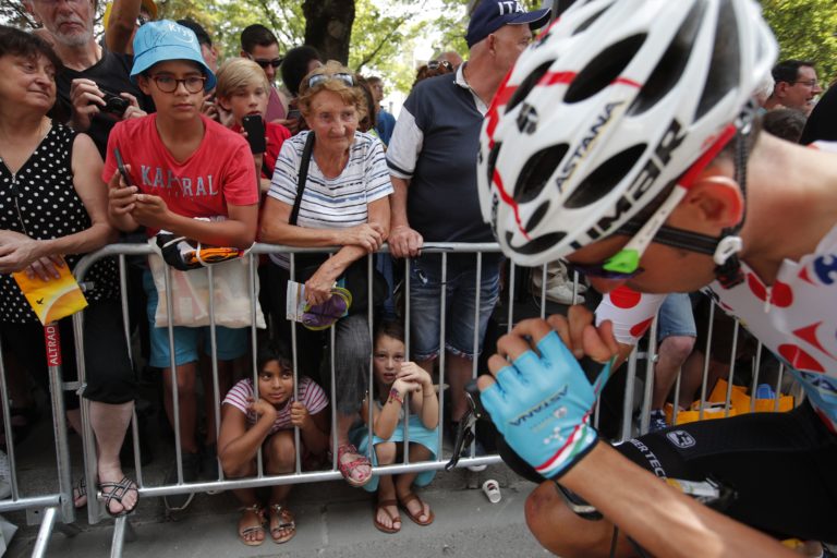 Taliansky cyklista Fabio Aru z tímu Astana v bodkovanom drese lídra vrchárskej súťaže pred štartom siedmej etapy 104. ročníka Tour de France z Troyes do Nuits-Saint-Georges (213,5 km). Troyes, 7. júl 2017. Foto: SITA/AP.