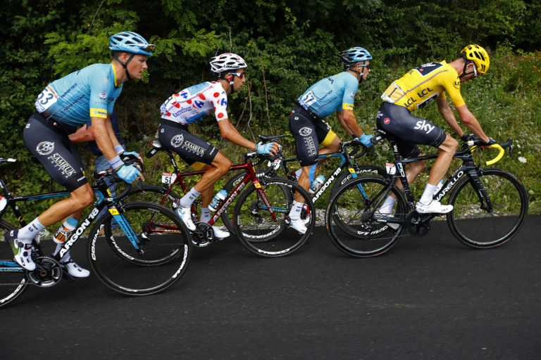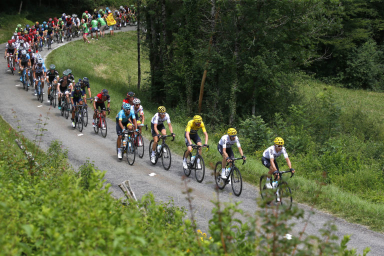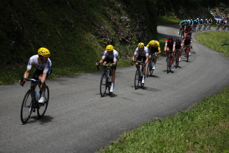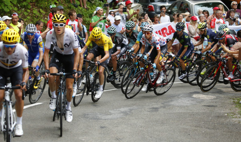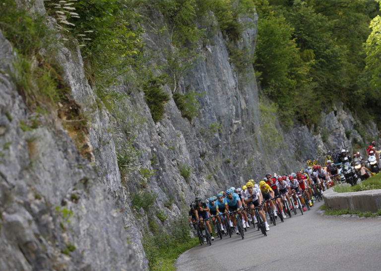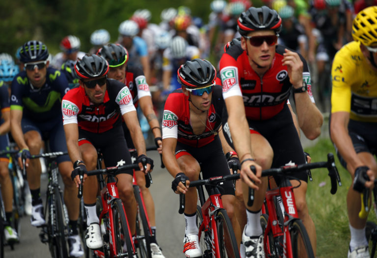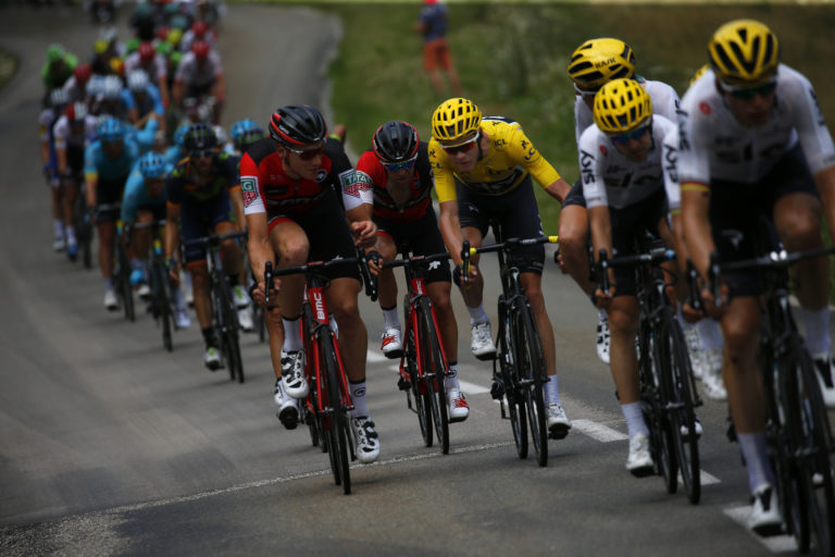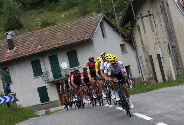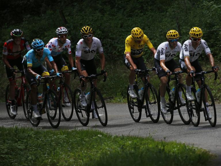 Austrálsky cyklista Richie Porte (uprostred) počas ôsmej etapy 104. ročníka Tour de France z Dole do Station des Rousses (187,5 km). Foto: SITA/AP.