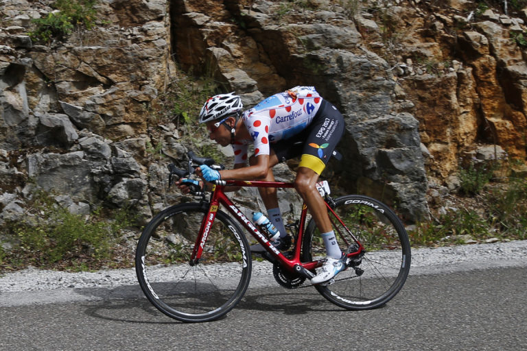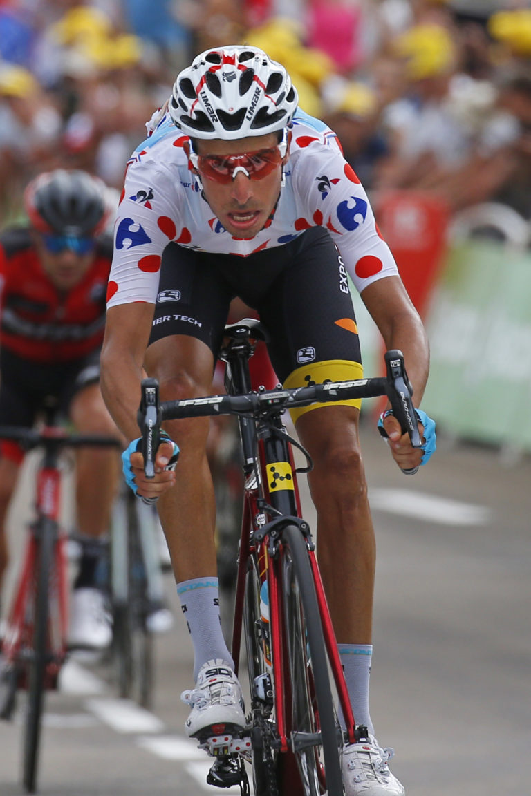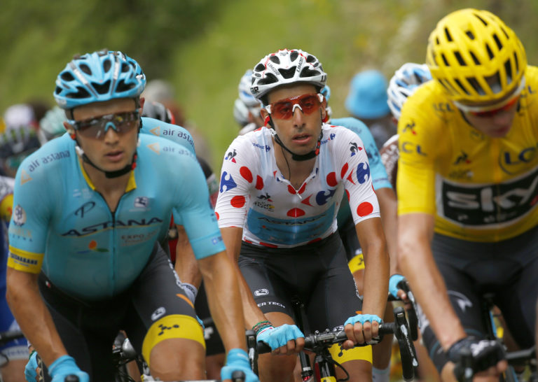 Taliansky cyklista Fabio Aru v drese lídra vrchárskej súťaže počas ôsmej etapy 104. ročníka Tour de France z Dole do Station des Rousses (187,5 km). Foto: SITA/AP.