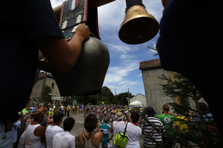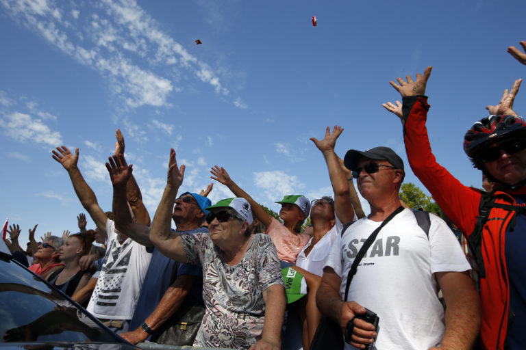 Návštevníci a fanúšikovia pozorujú pelotón, ktorý vyštartoval z francúzskeho mesta Dole. 8. júl 2017 Foto: SITA/AP