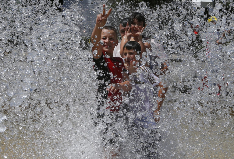 Deti sa hrajú vo fontáne pred začiatkom ôsmej etapy Tour de France. 8. júl 2017 Foto: SITA/AP