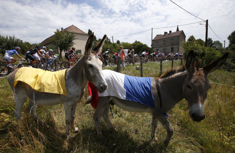 Dvojica somárov, oblečených do žltého dresu a francúzskej zástavy počas ôsmej etapy Tour de France. Foto: SITA/AP