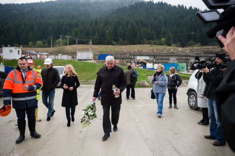 Minister dopravy a výstavby Arpád Érsek kladie kyticu kvetov na pracovný stôl zamestnankyne, ktorá v pondelok tragicky zahynula na západnom portáli stavby diaľničného tunela Višňové. Višňové, 11. apríl 2017. Foto: SITA/Milo Fabian