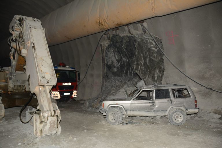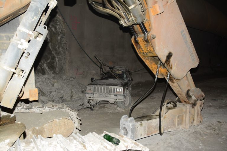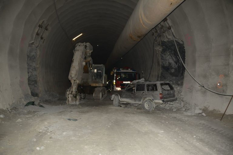 Miesto tragickej nehody v rozostavanom tuneli Višňové v okrese Žilina, ktorá si vyžiadala život mladej ženy. Polícia vyšetruje prípad ako usmrtenie. V pondelok podvečer 50-ročný muž pracovným strojom za zatiaľ nezistených okolností narazil do Jeepu Cherokee, v ktorom sedel 46-ročný vodič a 25-ročná žena. Mladá žena zomrela na mieste. Bratislava, 11. apríl 2017. Foto: SITA/KR PZ Žilina