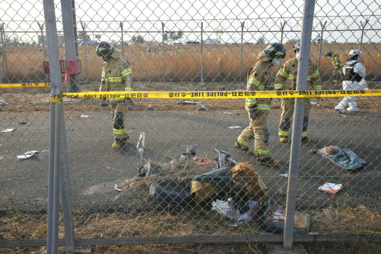 Hasiči a členovia záchranného tímu pracujú neďaleko trosiek lietadla, ktoré havarovalo na letisku v juhokórejskom meste Muan. Muan, 29. december 2024. Foto: Maeng Dae-hwan/Newsis via AP