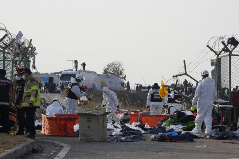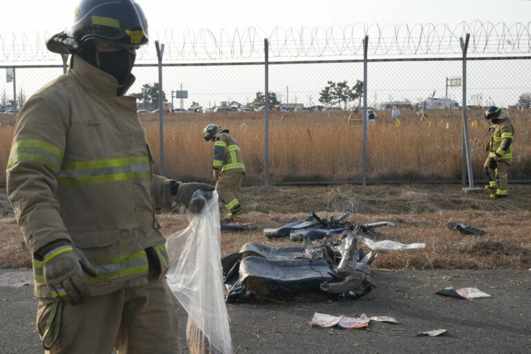 Hasiči a členovia záchranného tímu pracujú neďaleko trosiek lietadla, ktoré havarovalo na letisku v juhokórejskom meste Muan. Muan, 29. december 2024. Foto: Cho Nam-soo/Yonhap via AP