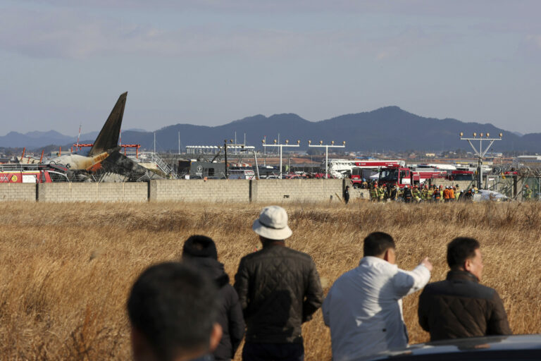 Ľudia sa prizerajú, ako hasiči a členovia záchranného tímu pracujú neďaleko trosiek lietadla, ktoré havarovalo na letisku v juhokórejskom meste Muan. Muan, 29. december 2024. Foto: Cho Nam-soo/Yonhap via AP