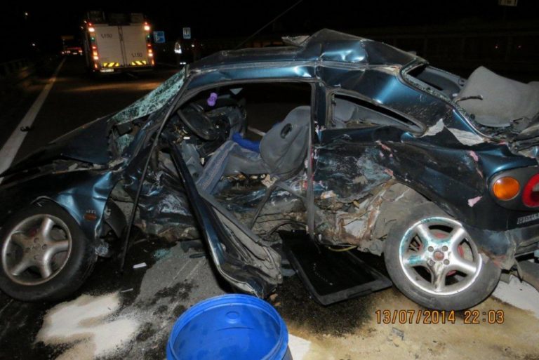 Dopravná nehoda s tragickým koncom sa stala v nedeľu v Žiline. Tridsaťjedenročný vodič, ktorý viedol Renault Megane Coupe, sa chcel v priamom úseku napriek zákazu otočiť a narazil do protiidúcej Škody Octavia. Neopatrný vodič na mieste zomrel, jeho 25-ročná spolujazdkyňa podľahla zraneniam cestou do nemocnice. Bratislava, 14. júl 2014. Foto: SITA/KR PZ Žilina
