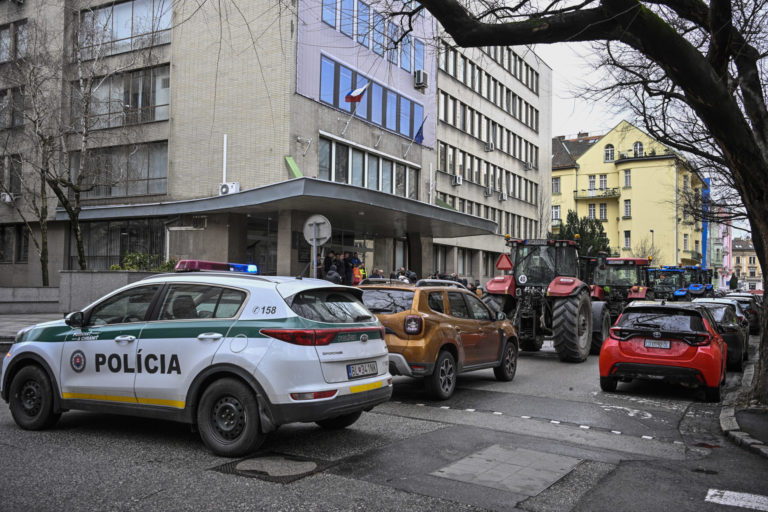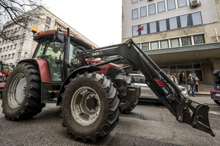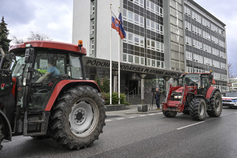 Prejazd poľnohospodárskych vozidiel pred budovou Poľnohospodárskej platobnej agentúry na Hraničnej ulici v Bratislave v rámci celoslovenského protestu farmárov, gazdov, roľníkov a poľnohospodárov. Bratislava, 19. február 2024. Foto: SITA/Marcel Mitaľ