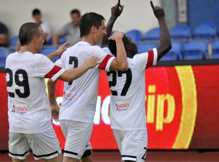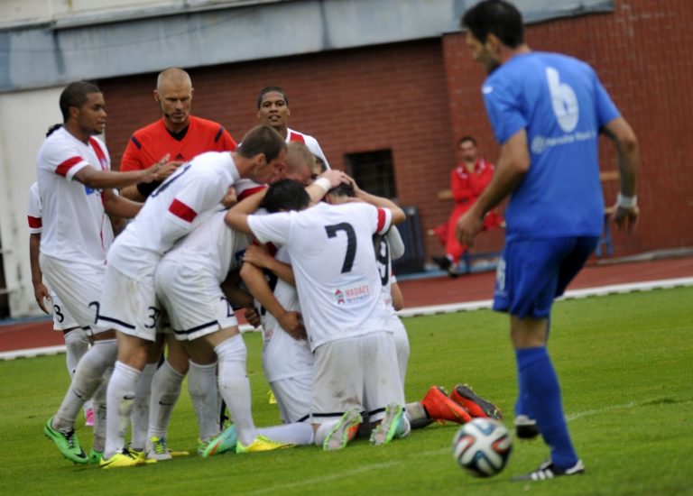 Hráči AS Trenčín sa radujú z gólu počas prvého zápasu druhého predkola futbalovej Európskej ligy UEFA medzi AS Trenčín (SR) - FK Vojvodina Novi Sad (Srbsko). Dubnica nad Váhom, 17. júl 2014. Foto: SITA/Tomáš Somr
