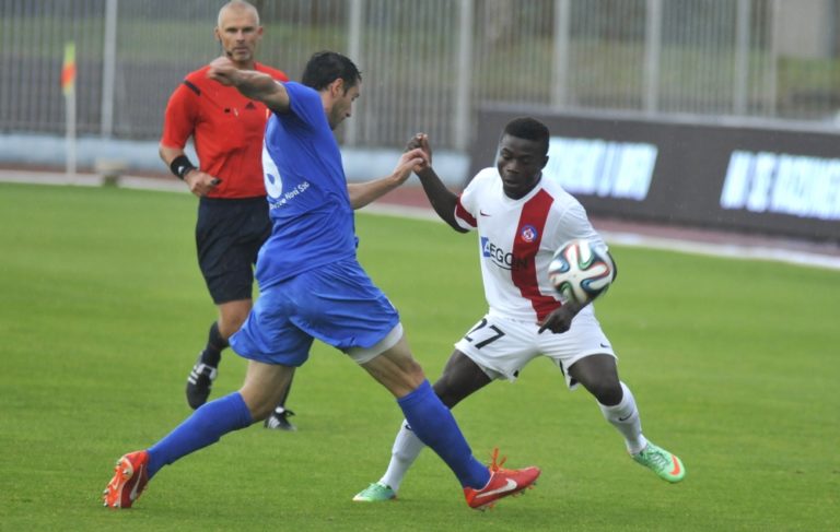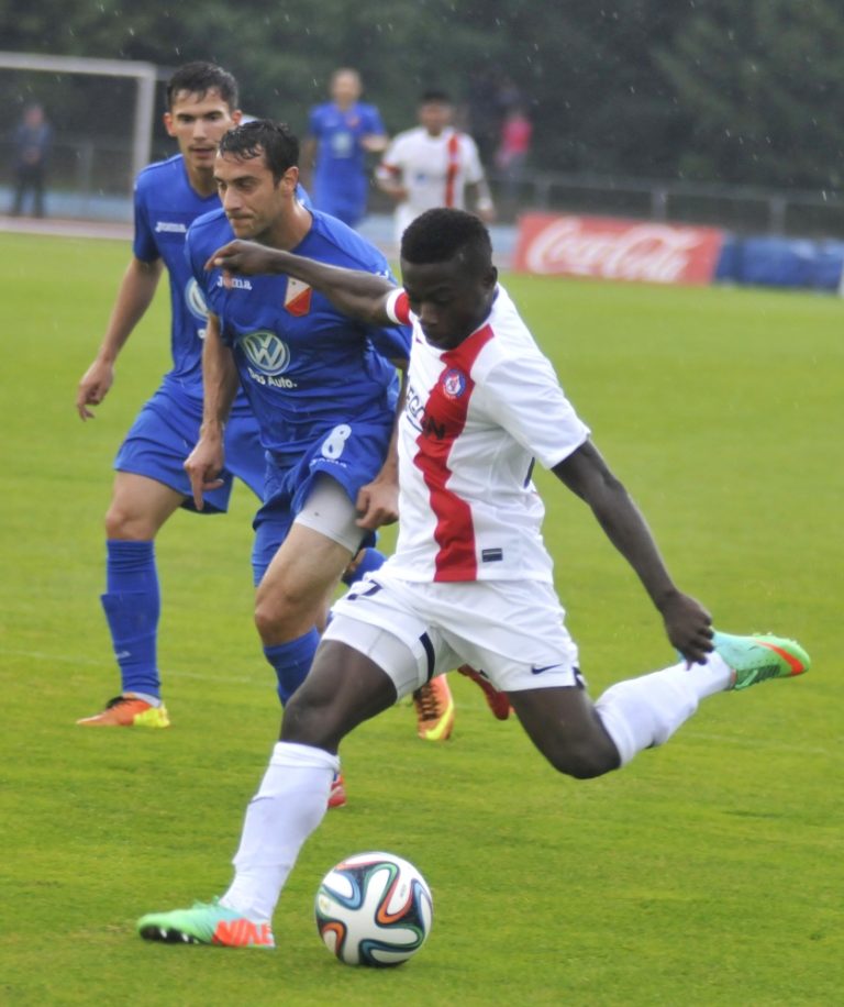 Moses Daddy Simon (v popredí) z AS Trenčín počas prvého zápasu druhého predkola futbalovej Európskej ligy UEFA medzi AS Trenčín (SR) - FK Vojvodina Novi Sad (Srbsko). Dubnica nad Váhom, 17. júl 2014. Foto: SITA/Tomáš Somr