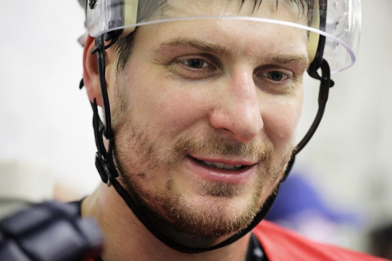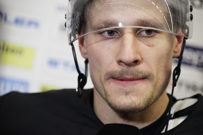 Michal Sersen v rozhovore pre médiá po tréningu slovenskej hokejovej reprezentácie pred zápasom USA - Slovensko na majstrovstvách sveta v ľadovom hokeji 2015 v Českej republike. Ostrava, Česká republika, 11. máj 2015. Foto: SITA/Ján Viazanička
