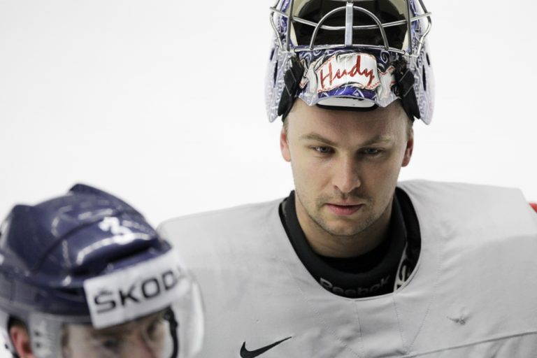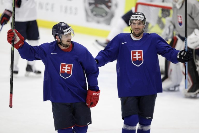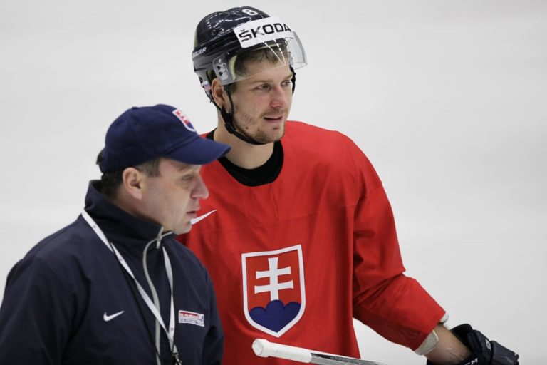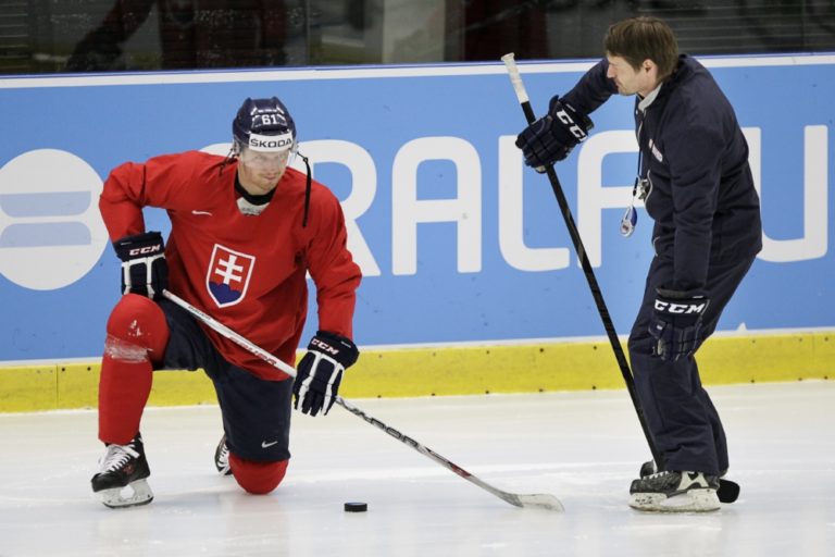 Július Hudáček (vpravo) počas tréningu slovenskej hokejovej reprezentácie pred zápasom USA - Slovensko na majstrovstvách sveta v ľadovom hokeji 2015 v Českej republike. Ostrava, Česká republika, 11. máj 2015. Foto: SITA/Ján Viazanička