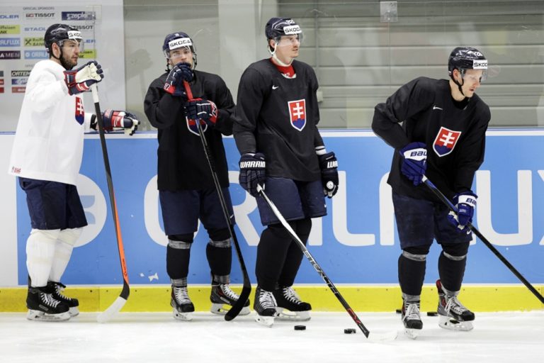 Zľava: Andrej Meszároš, Adam Jánošík, Tomáš Kopecký a Richard Pánik počas tréningu slovenskej hokejovej reprezentácie pred zápasom USA - Slovensko na majstrovstvách sveta v ľadovom hokeji 2015 v Českej republike. Ostrava, Česká republika, 11. máj 2015. Foto: SITA/Ján Viazanička