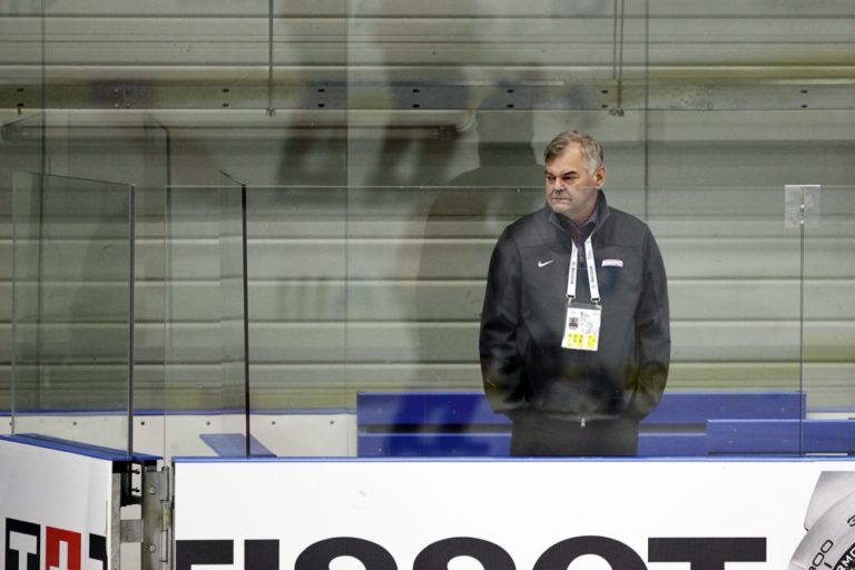 Tréner slovenskej reprezentácie Vladimír Vůjtek (vpravo) počas tréningu slovenskej hokejovej reprezentácie pred zápasom USA - Slovensko na majstrovstvách sveta v ľadovom hokeji 2015 v Českej republike. Ostrava, Česká republika, 11. máj 2015. Foto: SITA/Ján Viazanička