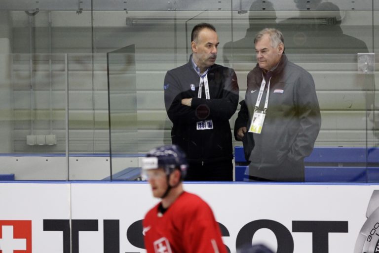 Prezident Slovenského zväzu ľadového hokeja Igor Nemeček (uprostred) a tréner slovenskej reprezentácie Vladimír Vůjtek (vpravo) počas tréningu slovenskej hokejovej reprezentácie pred zápasom USA - Slovensko na majstrovstvách sveta v ľadovom hokeji 2015 v Českej republike. Ostrava, Česká republika, 11. máj 2015. Foto: SITA/Ján Viazanička