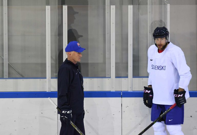 Zľava: Tréner slovenskej hokejovej reprezentácie Craig Ramsay a hokejista Tomáš Marcinko na tréningu slovenskej hokejovej reprezentácie v tréningovej hale počas ZOH 2018 v juhokórejskom Pjongčangu. Kórejská republika, Gangneung, 10. február 2018. Foto: SITA/Martin Medňanský
