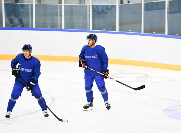Hokejisti slovenskej reperezentácie na tréningu v tréningovej hale počas ZOH 2018 v juhokórejskom Pjongčangu. Kórejská republika, Gangneung, 10. február 2018. Foto: SITA/Martin Medňanský