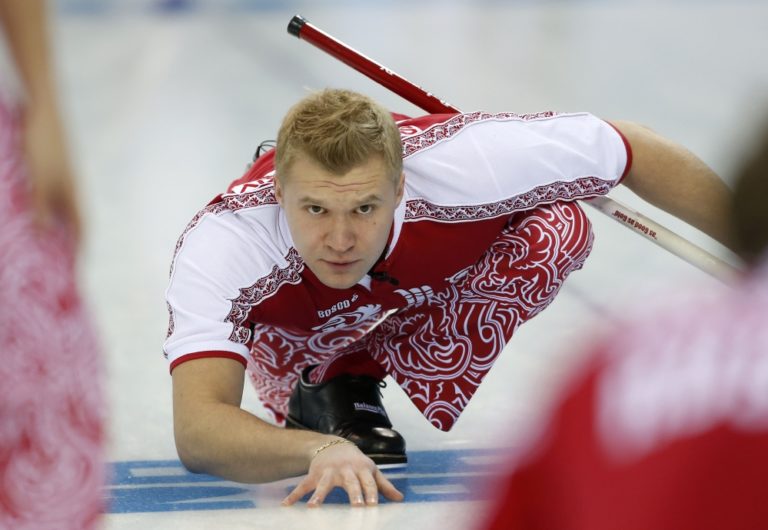 Ruský reprezentant v curlingu Alexej Stukalskii počas zápasu na olympijskom turnaji. Foto: SITA/AP