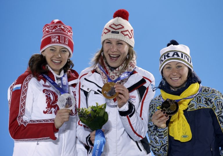 Slovenská reprezentantka v biatlone Anastasia Kuzminová počas medailového ceremoniálu na ZOH 2014 v Soči. Foto: SITA/AP
