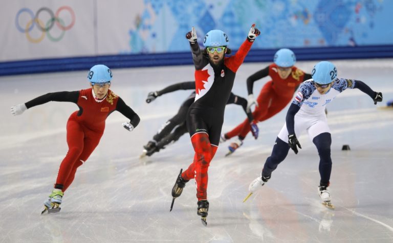 Charles Hamelin (uprostred) sa teší zo zisku zlatej medaily v pretekoch na 1500 metrov. Foto: SITA/AP