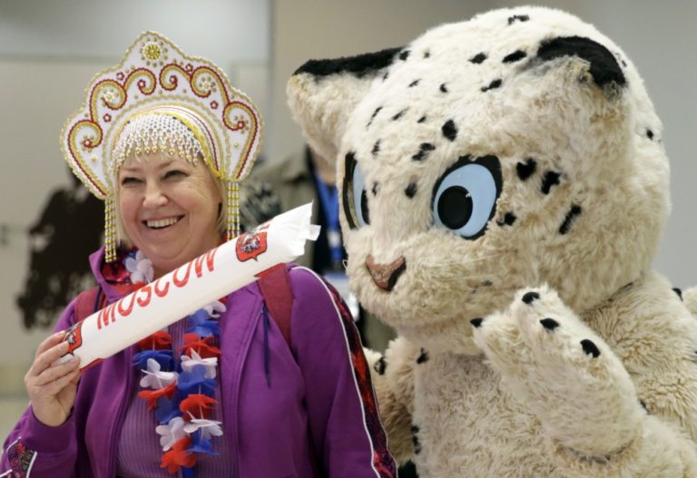 Maskot olympijských hier zabáva návštevníkov. Foto: SITA/AP