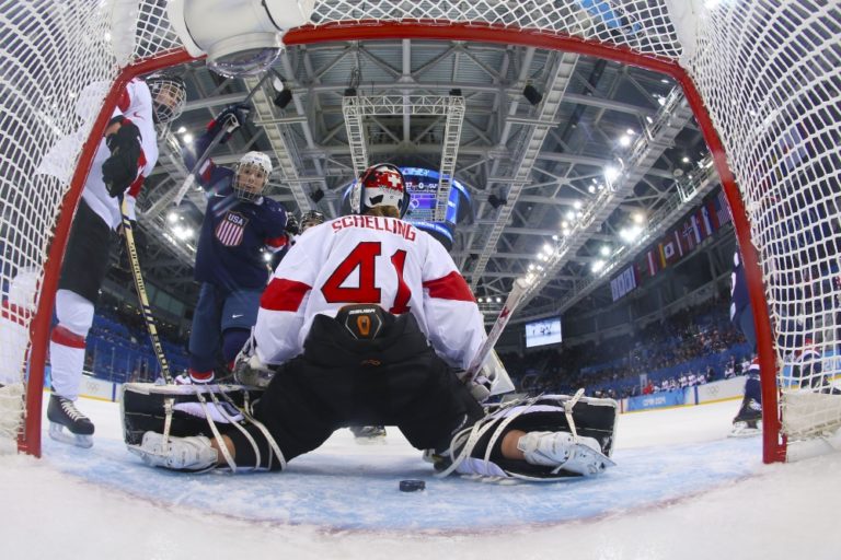 Americká hokejistka Hilary Knightová sa teší z gólu vo švajčiarskej sieti počas pondelňajšieho zápasu v rámci ženského olympijského turnaja, v ktorom Američanky hladko zvíťazili 9:0. Foto: SITA/AP