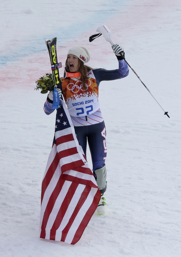Americká lyžiarka Julia Mancusová sa teší zo zisku bronzovej medaily v ženskej superkombinácii. Foto: SITA/AP
