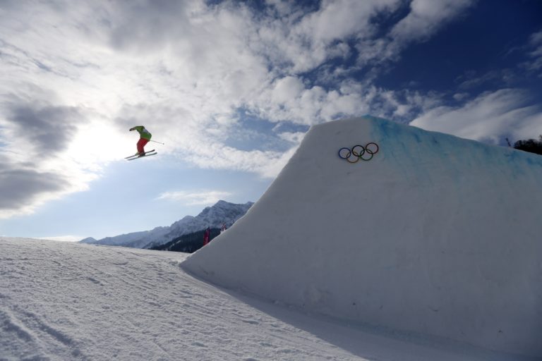 Američan Nicholas Goepper počas pondelňajšieho tréningu slopestylu v Extrémnom parku Roza Chutor. Foto: SITA/AP