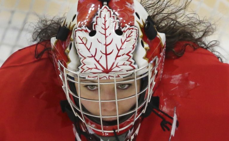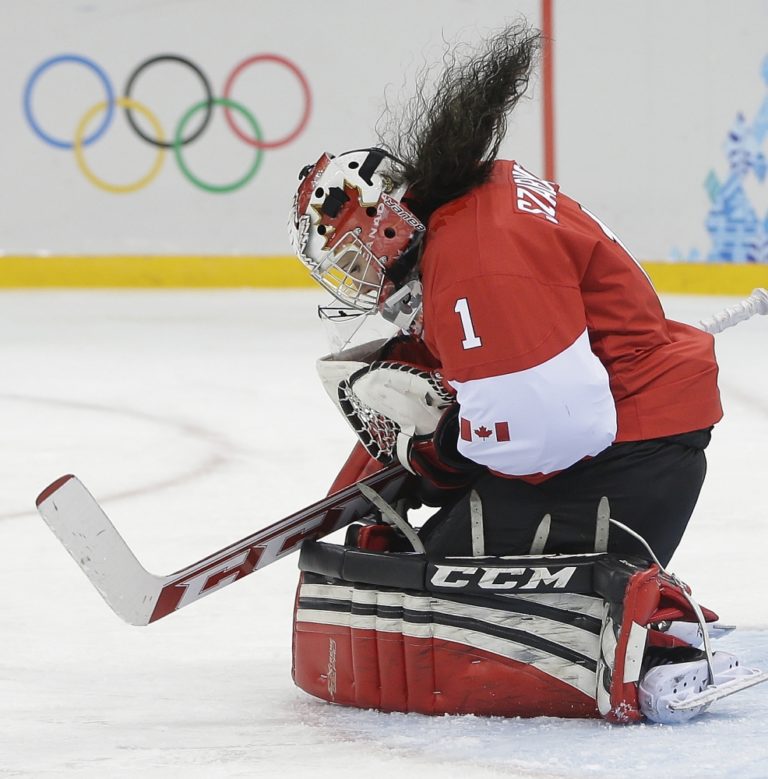 Kanadská brankárka Shannon Szabadosová počas pondelňajšieho zápasu na ženskom hokejovom turnaji, v ktorom reprezentantky 'javorového listu' porazili Fínsko 3:0. Foto: SITA/AP