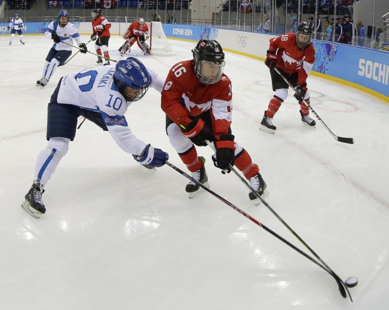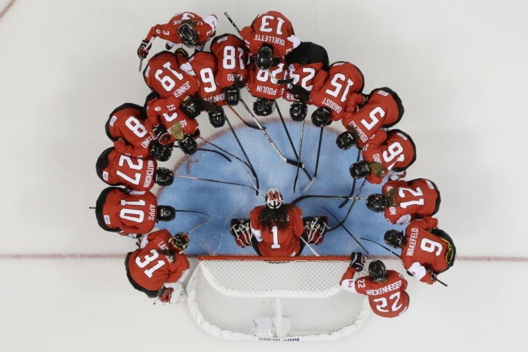 Kanadské hokejistky pred pondelňajším zápasom na ženskom olympijskom turnaji, v ktorom porazili Fínky 3:0. Foto: SITA/AP