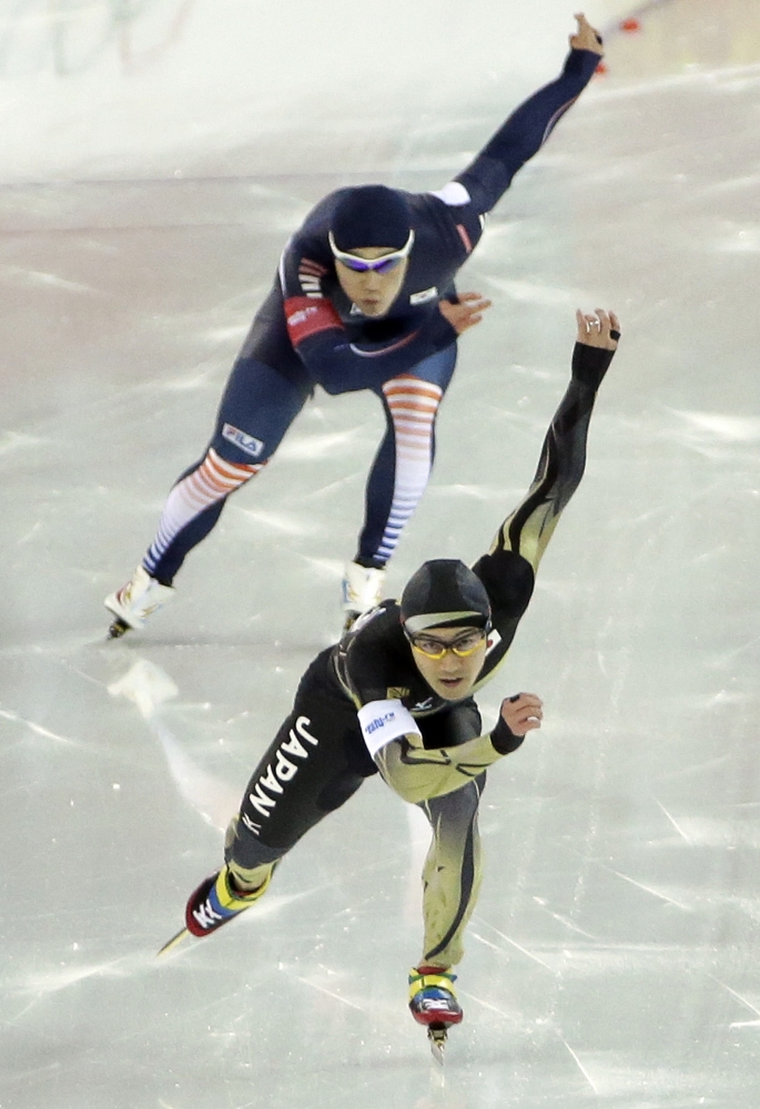 Japonec Joji Kato a Juhokórejčan Mo Tae-bum počas pretekov na 500 metrov. Foto: SITA/AP