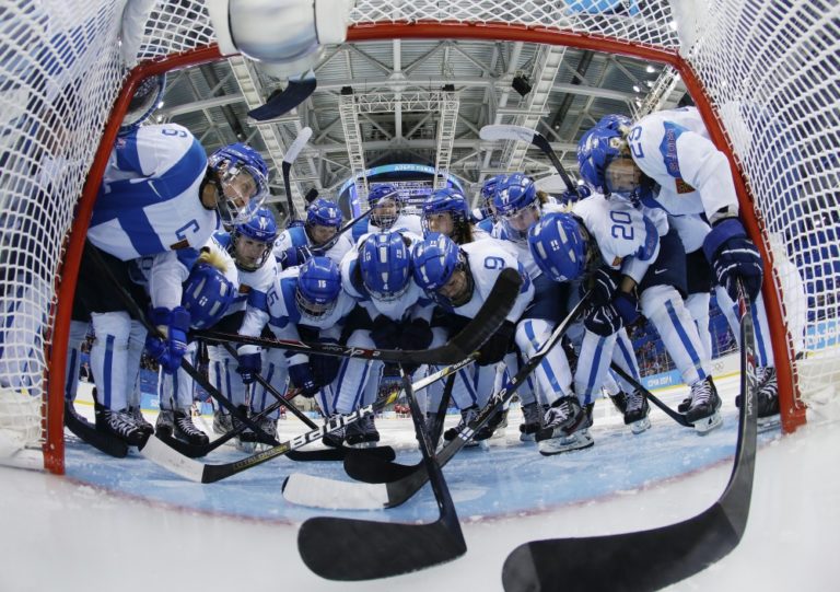 Fínske hokejistky pred pondelňajším zápasom s Kanaďankami, v ktorom prehrali 0:3. Foto: SITA/AP