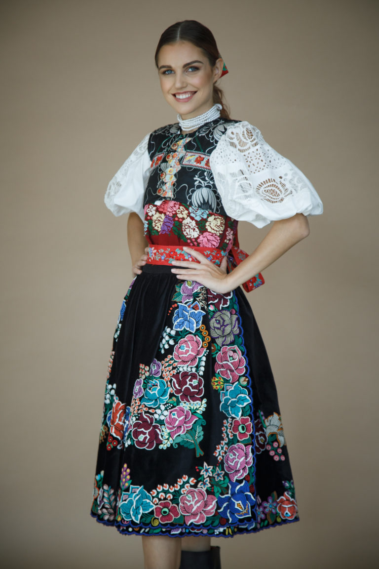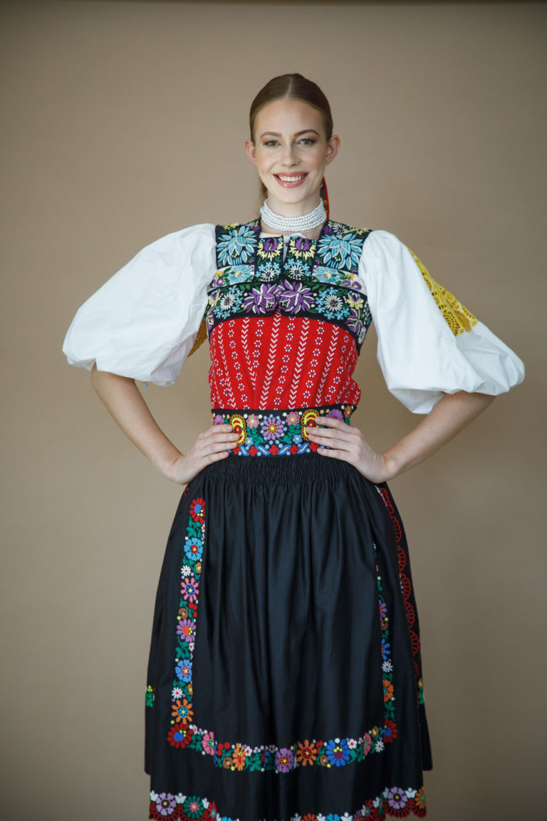 Miss Slovensko 2019 Frederika Kurtulíková v kroji z Podpoľania počas stretnutia novinárov s novým riaditeľom projektu MISS SLOVENSKO a módnym dizajnérom Michaelom Kováčikom a víťazkami 24. ročníka pred ich odchodom na svetové suťaže Miss World, Miss International a Miss Supranational. Bratislava, 22. október 2019. Foto: SITA/Branislav Bibel