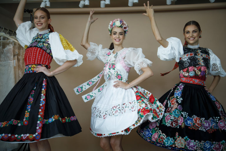 Zľava: 2. vicemiss Slovensko 2019 Natália Hrušovská, 1. vicemiss Slovensko 2019 Alica Ondrášová a Miss Slovensko 2019 Frederika Kurtulíková v národných krojoch počas stretnutia novinárov s novým riaditeľom projektu Miss Slovensko a módnym dizajnérom Michaelom Kováčikom a víťazkami 24. ročníka pred ich odchodom na svetové suťaže Miss World, Miss International a Miss Supranational. Bratislava, 22. október 2019. Foto: SITA/Branislav Bibel