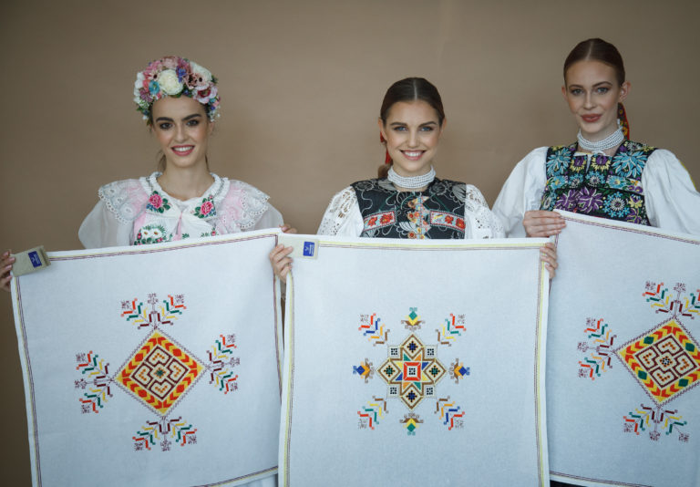 Zľava: 1. vicemiss Slovensko 2019 Alica Ondrášová, Miss Slovensko 2019 Frederika Kurtulíková a 2. vicemiss Slovensko 2019 Natália Hrušovská v národných krojoch so Slovenskými vyšívanými obrusmi z Ú¼UVu počas stretnutia novinárov s novým riaditeľom projektu Miss Slovensko a módnym dizajnérom Michaelom Kováčikom a víťazkami 24. ročníka pred ich odchodom na svetové suťaže Miss World, Miss International a Miss Supranational. Bratislava, 22. október 2019. Foto: SITA/Branislav Bibel