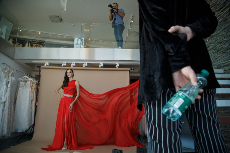Druhá vicemiss Slovensko 2019 Natália Hrušovská v šatách zo Salónu WEM počas stretnutia novinárov s novým riaditeľom projektu Miss Slovensko a módnym dizajnérom Michaelom Kováčikom a víťazkami 24. ročníka pred ich odchodom na svetové suťaže Miss World, Miss International a Miss Supranational. Bratislava, 22. október 2019. Foto: SITA/Branislav Bibel