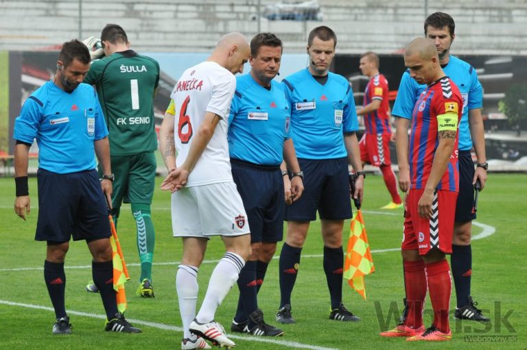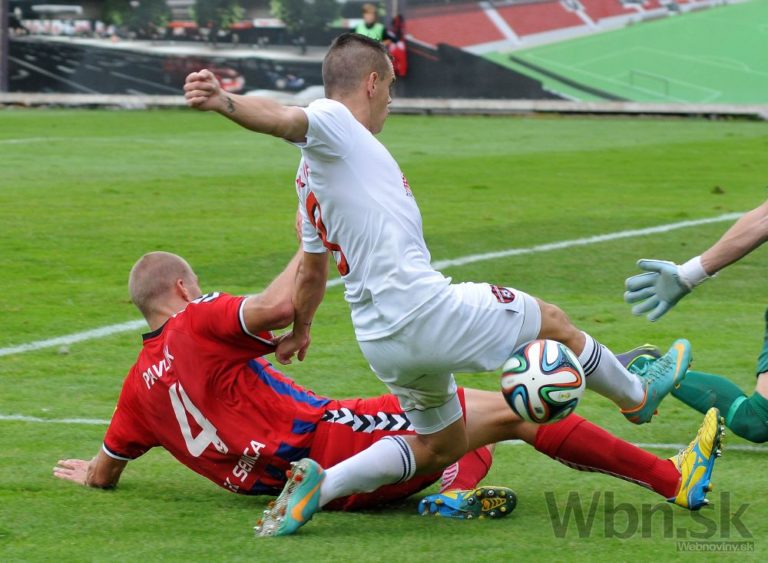 Sprava: Hráč Trnavy Martin Mikovič a hráč Senice Petr Pavlík počas 8. kola Fortuna ligy 2014/2015 medzi FC Spartak Trnava a FK Senica. Trnava, 31. august 2014. Foto: SITA/Ivan Kopčáni
