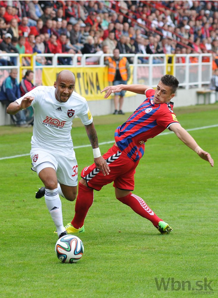 Zľava: Hráč Trnavy Cleber Silva a hráč Senice Róbert Mazáň počas 8. kola Fortuna ligy 2014/2015 medzi FC Spartak Trnava a FK Senica. Trnava, 31. august 2014. Foto: SITA/Ivan Kopčáni
